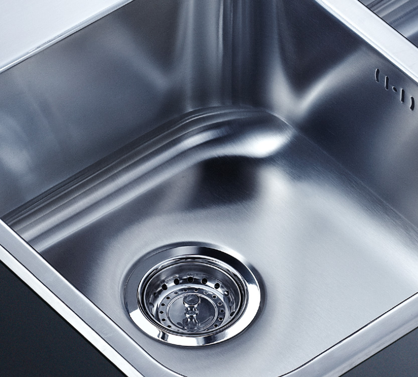 阿發水槽整體經拉絲處理,質地更加光滑,視覺更加柔和。能有效抵擋異物撞擊,刮傷及磨損,防止油污沾染,常用常新;柔和的光澤令水槽平添高雅氣質,更能避免鏡面材質反射的光污染