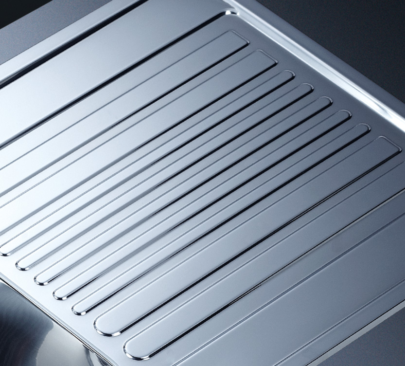 槽底采用斜面壓痕,四輻導流槽設計,與平面壓痕和無痕水槽相比,導水更為流暢,下水更迅速,能有效防止積水,消除沉淀物