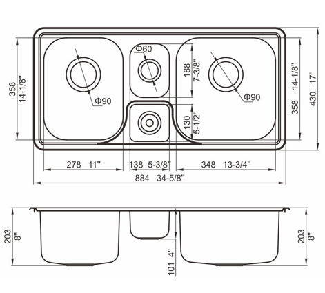 槽底采用斜面壓痕,四輻導(dǎo)流槽設(shè)計(jì),與平面壓痕和無(wú)痕水槽相比,導(dǎo)水更為流暢,下水更迅速,能有效防止積水,消除沉淀物